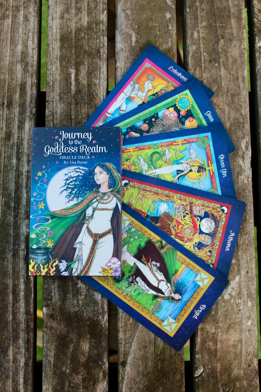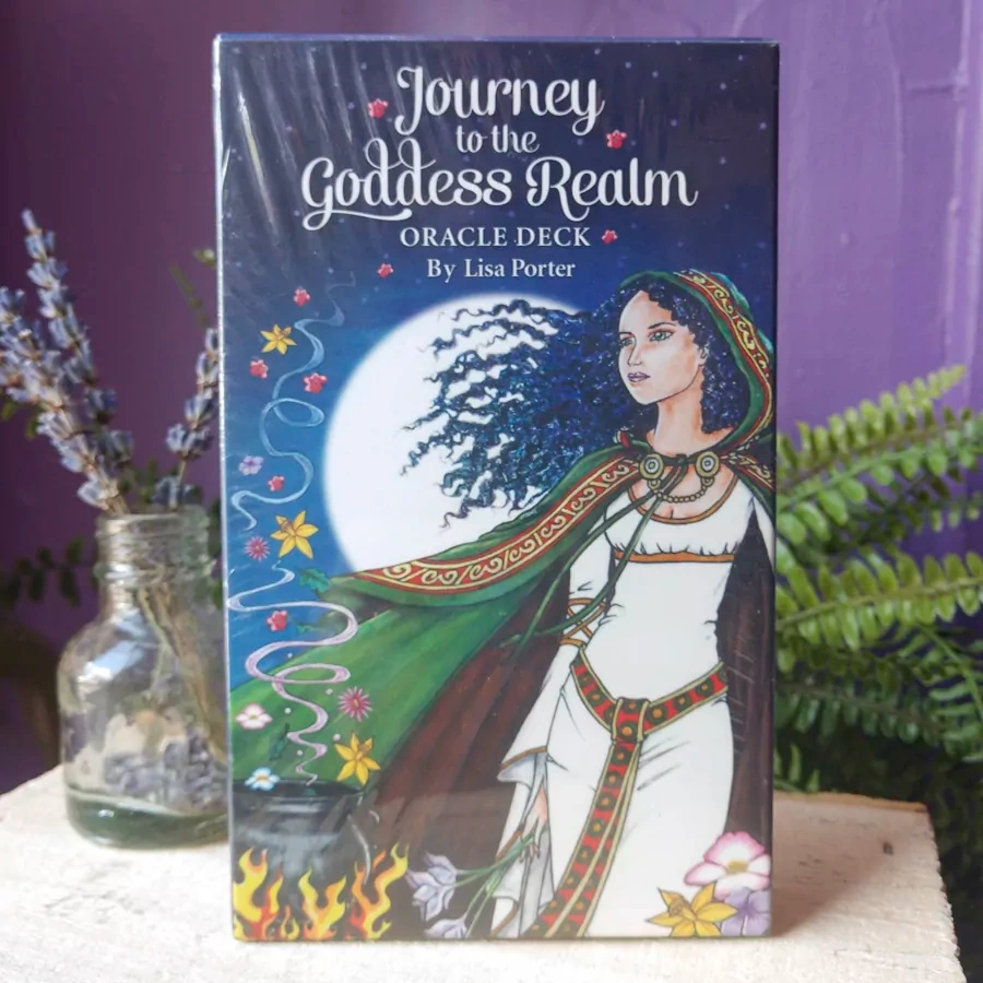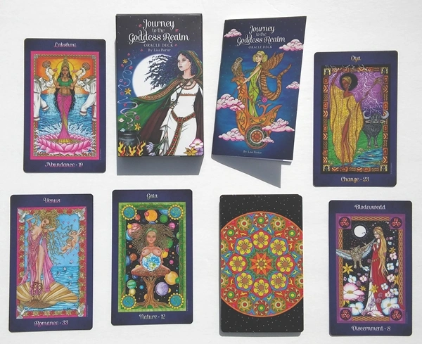 Bộ bài Journey to the Goddess Realm gồm 39 lá, trong đó có 36 lá Nữ Thần, 3 lá Xác Nhận, cùng sách hướng dẫn 48 trang.