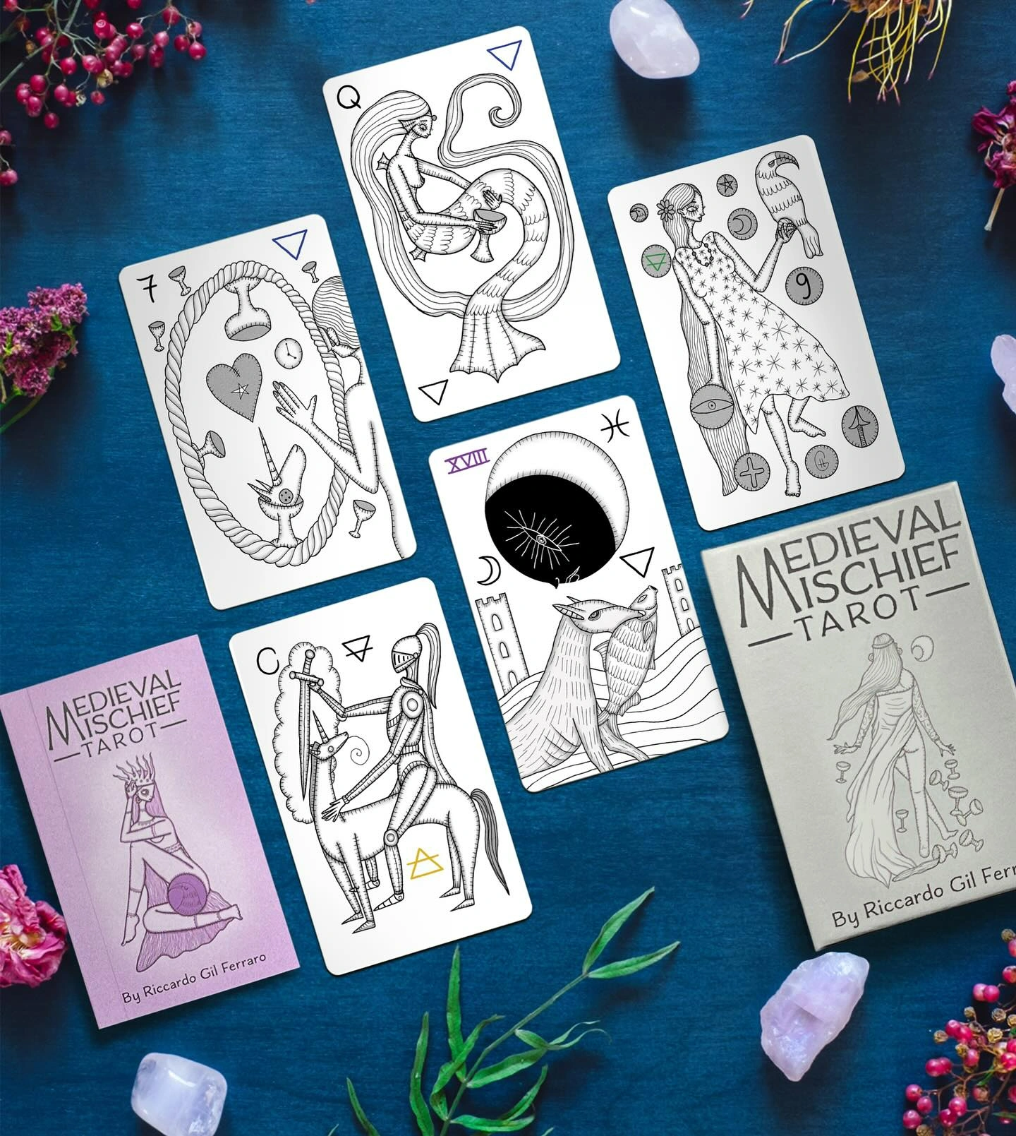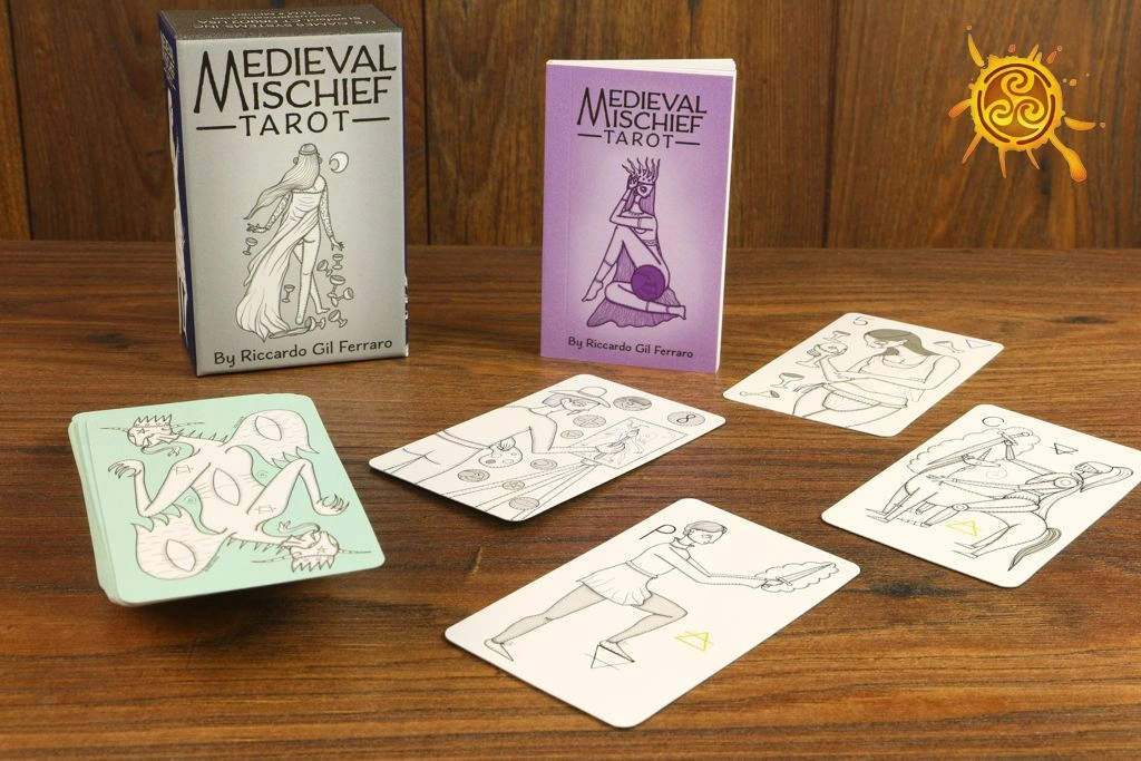 Medieval Mischief Tarot cung cấp các liên hệ nguyên tố và chiêm tinh qua những bức minh họa dí dỏm trên các lá bài không viền và không chữ. Những vua, hiệp sĩ, tiểu thư và ác quỷ sẽ dẫn bạn trên con đường khám phá bản thân.