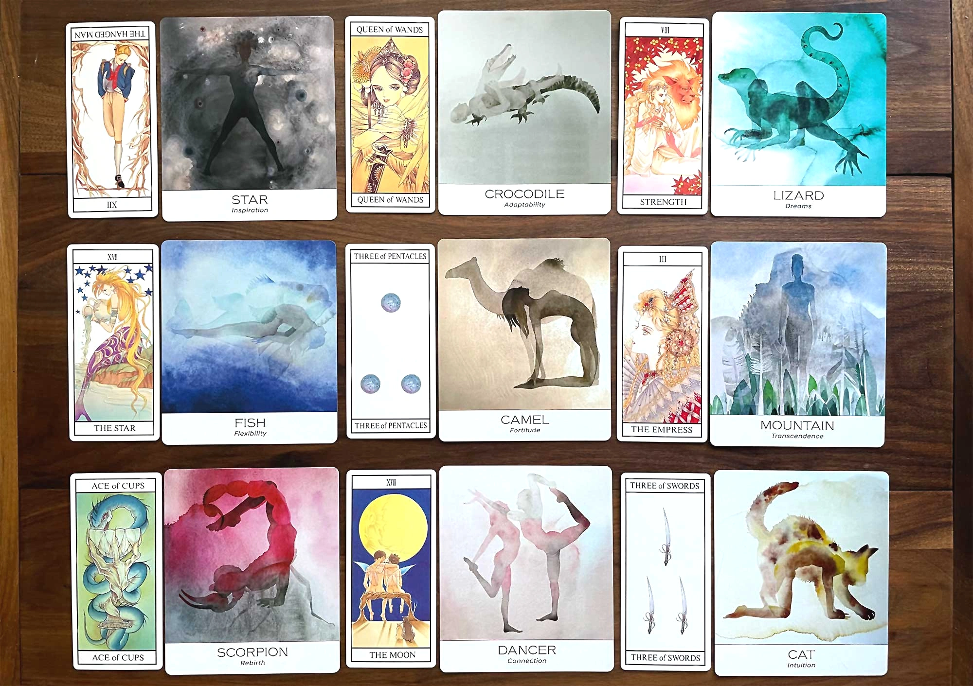 Trong bộ bài này, các tư thế yoga quen thuộc được kết hợp trực quan với những nguyên mẫu linh vật đầy sức mạnh cùng hình ảnh của đất – nước – gió – lửa, tạo nên một tầng ý nghĩa mới cho thực hành yoga và thiền định.