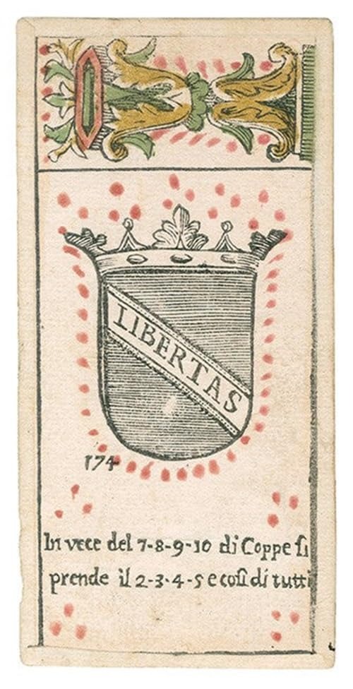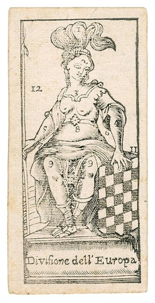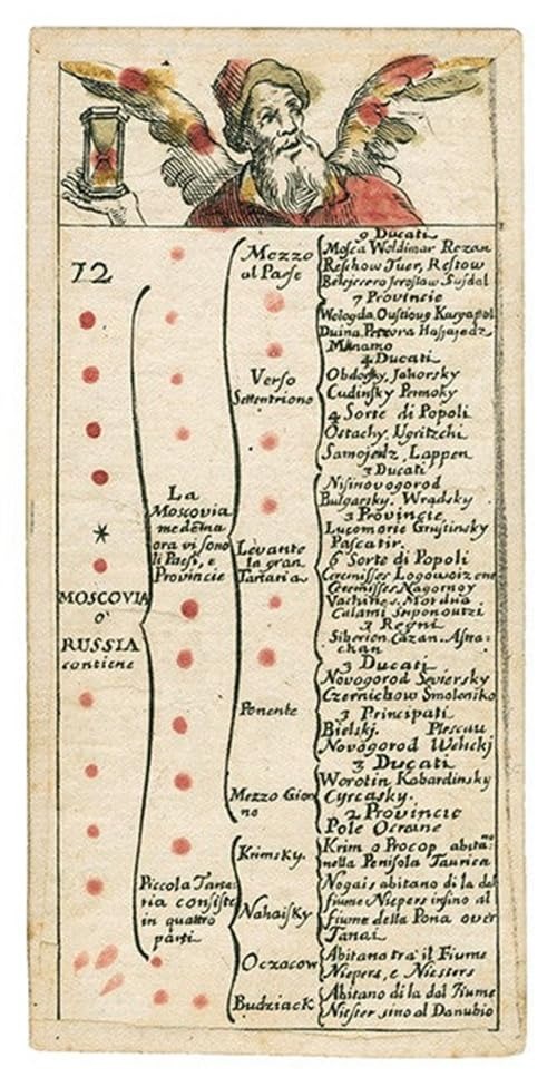 📖 Các lá bài chứa những ghi chú thú vị của Montieri về xã hội, chính trị và địa lý thế kỷ 18, cùng với hoa văn và minh họa độc đáo.